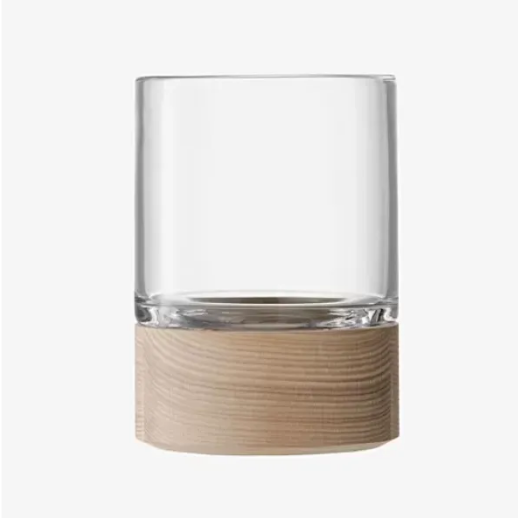 A giant mouth-blown glass vase/lantern with a sustainably-sourced ash base. A step in the base of the vase nests inside the wood. The glass and wood are the same width for a streamlined silhouette. Designed for floor standing displays of tall branches or pinecones.